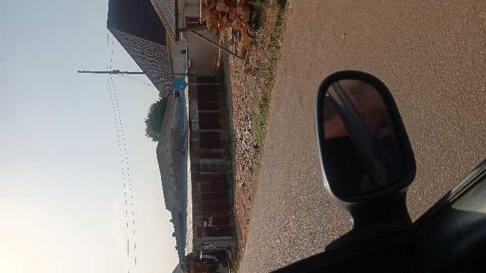 A side view mirror dominates the right foreground. A road stretches vertically to the right of the mirror, its surface a textured mix of browns and grays. Adjacent to the road, a low wall borders a building with a dark, pitched roof. Power lines are visible in the distance. The sky is a light blue, providing a backdrop to the scene. The image is oriented vertically.