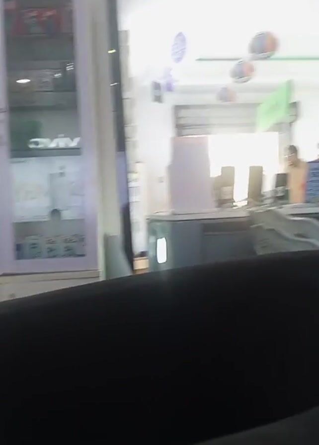 The video depicts the interior of a mobile phone store. In the foreground, a dark, blurry object, possibly a seat, partially obscures the view. Beyond this, the scene opens up to reveal display cabinets filled with boxed mobile phones, predominantly featuring the Vivo brand. Further in, a counter is visible with several employees standing behind it. Some customers are visible beyond the counter. The lighting is bright, and the overall atmosphere appears to be that of a retail environment.