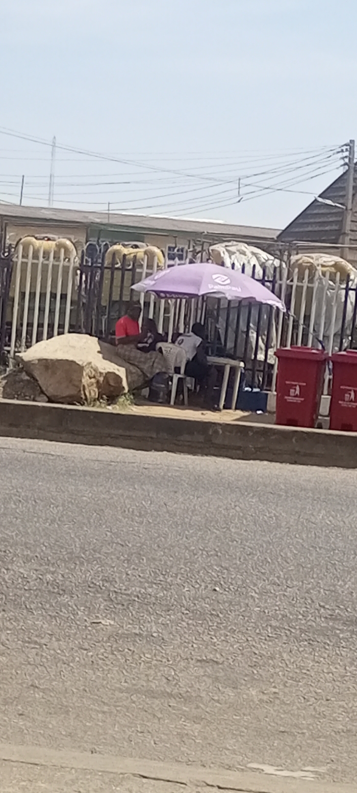 The image displays a bright daylight scene in Sardauna, Nigeria. In the foreground, an asphalt road surface occupies the lower half of the frame, bordered by a concrete curb. Above the curb, a large, irregular light-brown rock formation is situated to the left. To the right of the rock, two individuals are seated under a purple umbrella, which features the "PalmPay" logo. One person, wearing a red shirt and patterned lower garment, is positioned on the rock. The second person, in a light-colored shirt, sits on a white plastic chair at a small white plastic table. A black backpack is visible on the ground near the table. To the right of this seating arrangement, two red rectangular plastic bins are present. Behind the people and the umbrella, a dark metal fence with vertical bars is visible. Behind this fence, multiple large, light-colored cylindrical tanks are arranged. In the background, a building roofline is partially visible, and numerous overhead power lines traverse a clear, bright sky, with a utility pole visible on the far left.