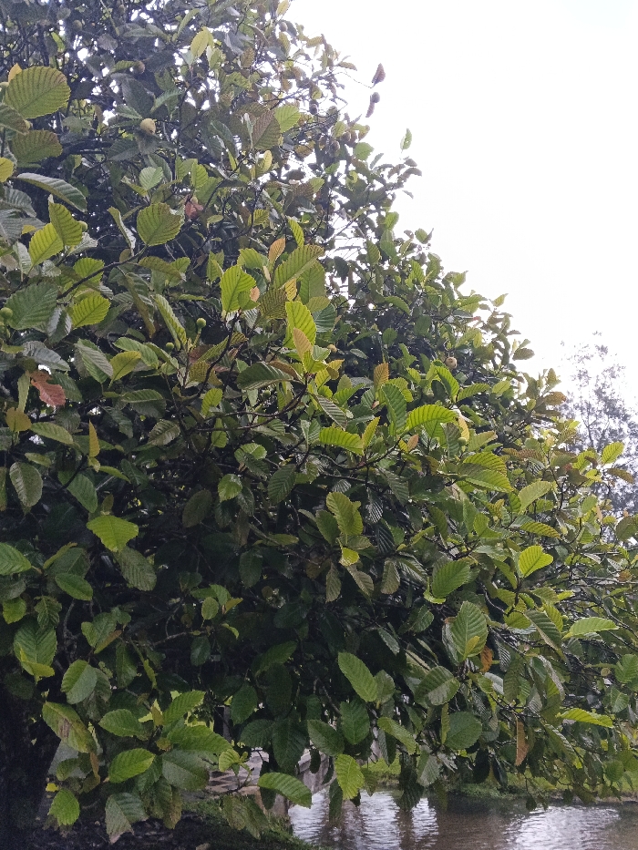 Lush green foliage dominates the scene, filling the frame with dense leaves and branches. Some leaves display hints of lighter green or brown hues, suggesting varying stages of maturity. Scattered among the leaves are round, brown fruits. The canopy extends upwards, partly obscuring a gray-white sky. The base of the tree and its reflection can be seen by the water.