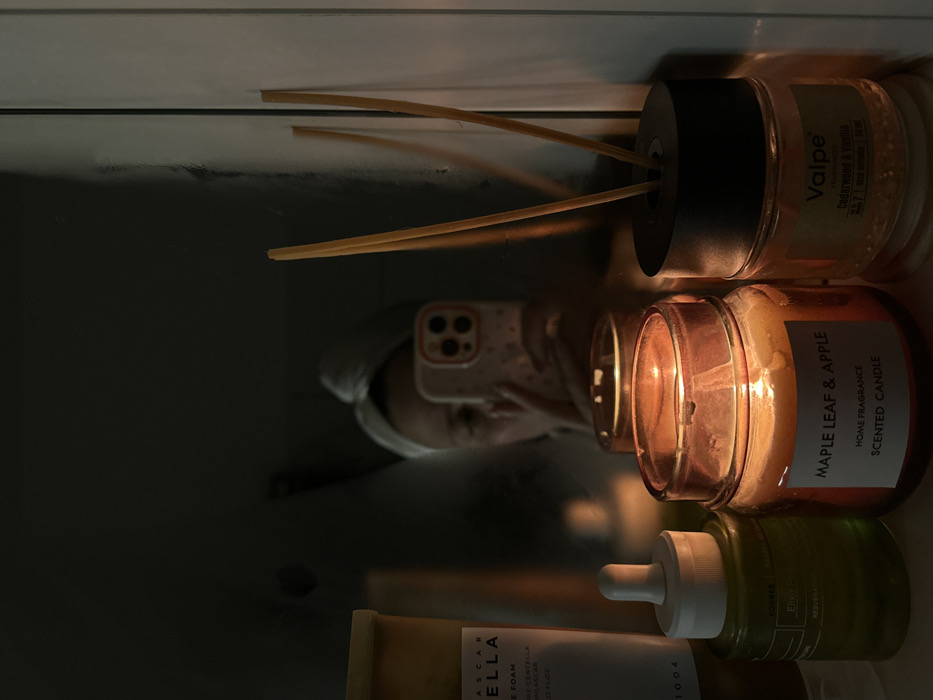 The image displays an indoor scene illuminated by warm, dim light, primarily from a lit candle. A person is reflected in a mirror that occupies the upper portion of the frame. The individual's head is covered with a white towel, and they are holding a light-colored smartphone with a visible multi-lens camera array, appearing to take a selfie. Their eyes and forehead are discernible in the reflection. On a surface in the foreground, from left to right, are several items: - A partially visible tall, yellowish-brown container with text including "SCAR CELLA" and "FOAM CENTELLA". - A small, clear glass bottle containing a green liquid, topped with a white dropper cap. - A lit "MAPLE LEAF & APPLE HOME FRAGRANCE SCENTED CANDLE" in a brown glass jar, casting an orange glow. - A "Valpe Cedarwood & Vanilla" diffuser, consisting of a clear glass jar with a black lid from which several light-colored reeds protrude. The objects and the surface they rest upon are reflected in the mirror. The specific location within the city of Šušanj, Montenegro, is not discernible from the visual information provided.