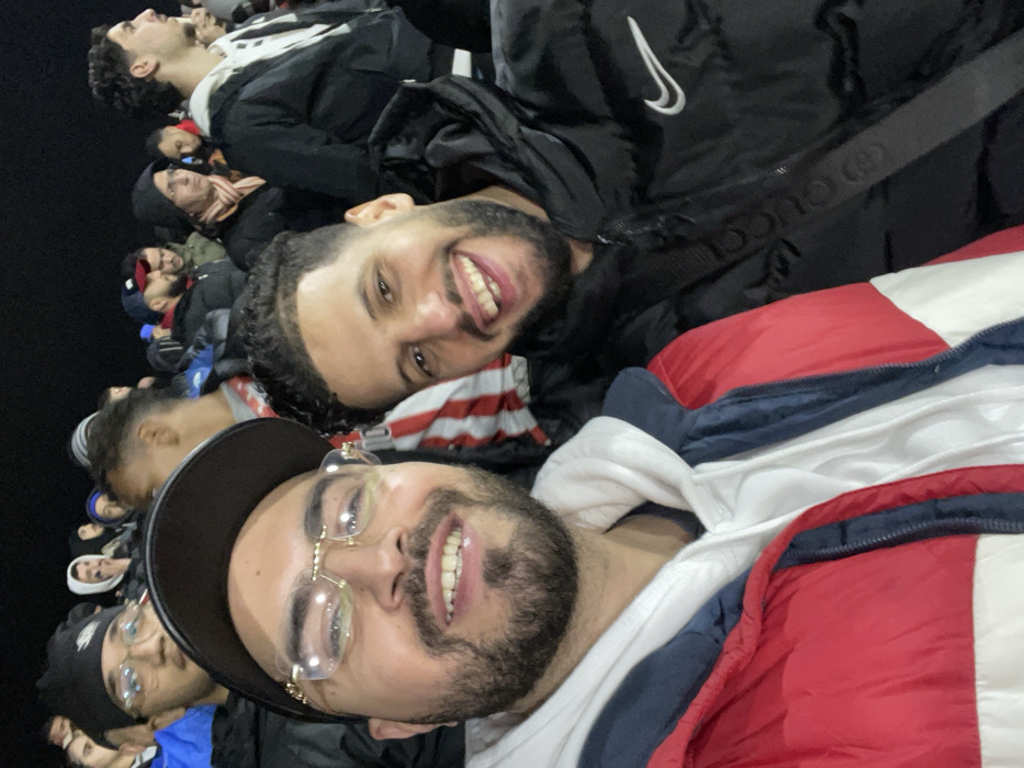 A group selfie shows two men in the foreground smiling. The man in front wears a black cap and gold-rimmed glasses with a white shirt and red, white, and blue jacket. The man behind him wears a black jacket with a white Nike swoosh and a Gucci-branded strap. Behind them are several other people, faces visible, who are looking in various directions. The background is dark and out of focus.