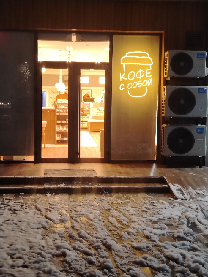 A coffee shop entrance is visible at night. The glass door is flanked by a neon sign of a coffee cup and Russian text. Three air conditioning units are stacked on the right side of the entrance. The storefront is elevated by three steps. Snow covers the foreground, adding to the wintry feel. The interior of the coffee shop is warmly lit.