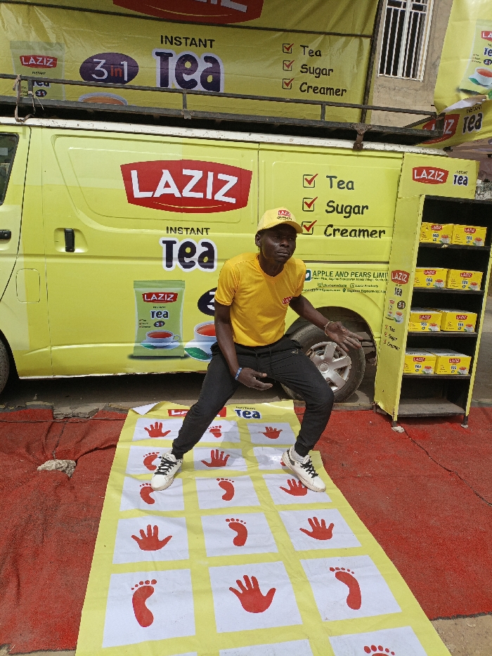 An outdoor scene in Fagge C, Nigeria, depicts a male individual interacting with a promotional display for "LAZIZ INSTANT Tea