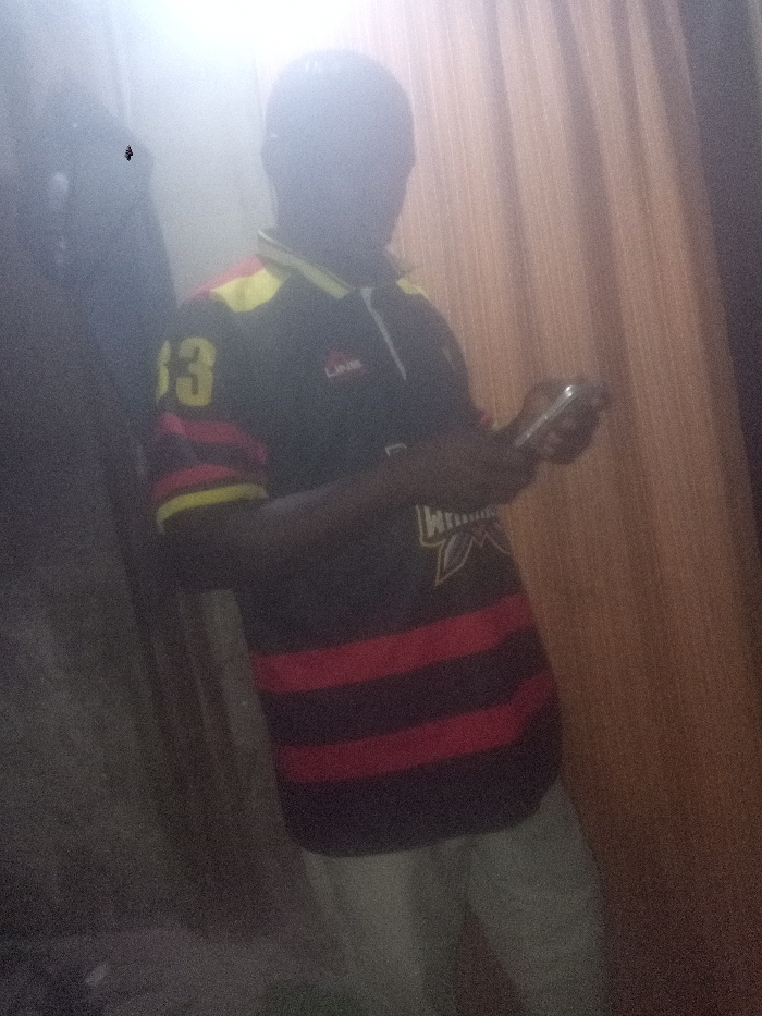 A person stands indoors, holding a phone. The person is wearing a dark polo shirt with red horizontal stripes across the torso and yellow accents on the sleeves and collar. A large yellow "13" is on the sleeve. The shirt also has a logo or design near the stomach. The person's pants are light-colored. The background includes a dark wall or object to the left and a curtain or textured wall to the right. The image is poorly lit.