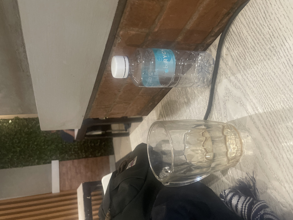 The scene, an interior view within a commercial establishment in Banda Aceh, Indonesia, features a light-colored, horizontally-lined table surface under artificial lighting. In the immediate foreground on the left, a black bag or backpack with brown accents is positioned next to a clear glass mug containing a minimal amount of light-brown residual liquid. A black and white striped textile with tassels is visible below the bag. To the right, a small, clear plastic bottle of "beRYCH water" with a white screw cap and a blue label is situated upright against a two-toned vertical surface; the lower section consists of red brickwork, and the upper section is painted light grey. A dark electrical cable runs horizontally across the table surface between the mug and the water bottle, extending towards the right edge of the frame. In the mid-ground, a dark wooden table is partially visible behind the two-toned vertical surface. Further into the background, a person with dark hair and a dark shirt is partially obscured by a table and the surrounding structures. A wall adorned with vertical wooden slats is visible to the far left, and a section of wall covered in artificial green foliage is discernible in the center-left background.