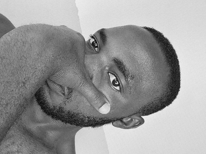 A black and white, close-up portrait depicts an adult male from the chest upwards, situated in the city of Jos, Nigeria. He has short, dark, closely-cropped hair and a dark, trimmed beard and mustache. His left hand is raised with the palm partially obscuring the lower half of his face, covering his nose and mouth with his fingers. His index finger rests near his right cheekbone. Both of his dark eyes are open and directed towards the viewer. The visible skin on his face, hand, and upper chest is smooth. The background is a plain, light-toned wall.