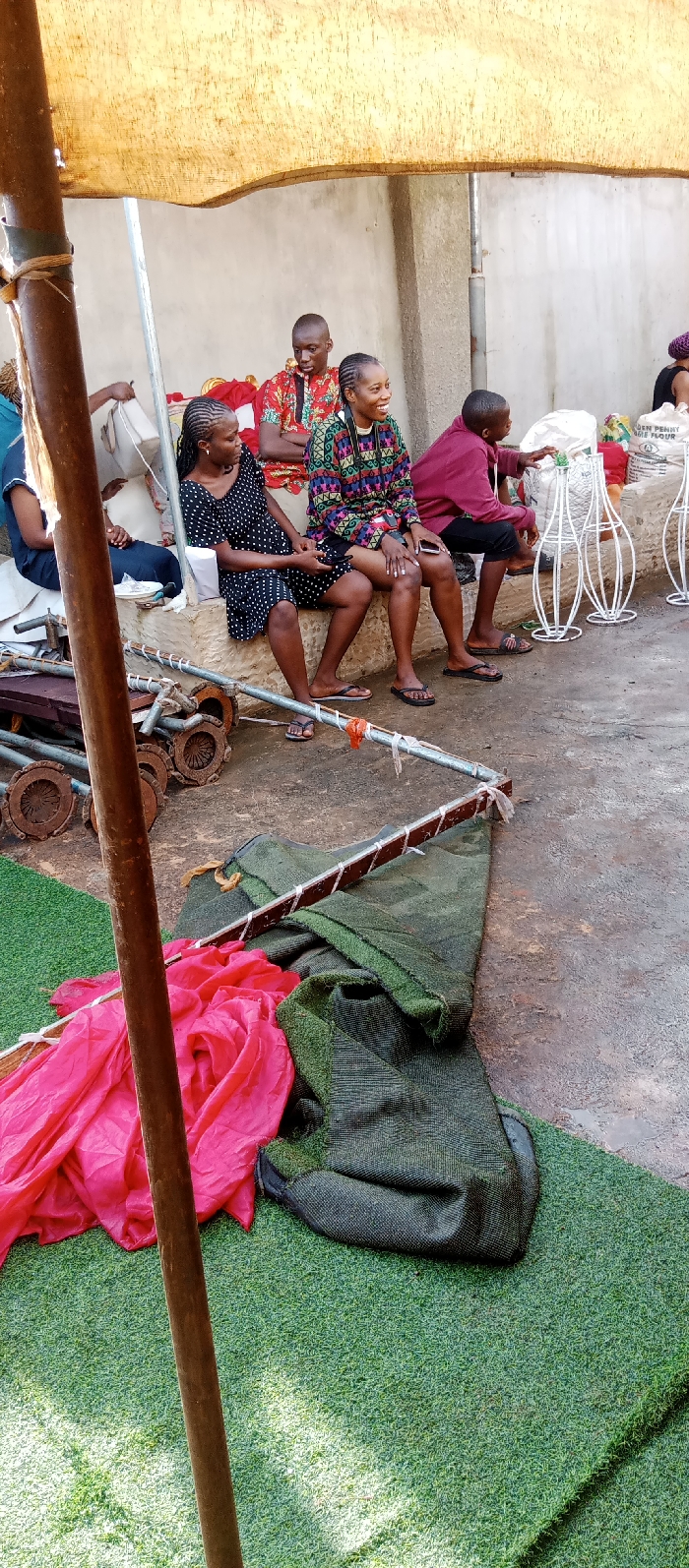 In Udi, Nigeria, an outdoor scene unfolds under a makeshift yellow-beige tarp canopy. The ground surface consists of a concrete slab, with sections covered by artificial green turf. In the foreground, a tall, weathered wooden pole stands vertically. To its left, a bright pink fabric lies crumpled on the turf, adjacent to a folded dark green, coarse fabric. Immediately behind these fabrics, on the concrete, a pile of rusted metal pipes and circular metal components are visible, alongside an L-shaped metal frame wrapped in white material. In the midground, five individuals are seated. On the left, partially obscured, a person in a dark blue garment is visible. To their right, a woman with braided hair, wearing a black dress with white polka dots, sits on a low concrete ledge, looking towards her right. Next to her, a man with short hair, dressed in a red, orange, and green patterned shirt, sits on a red cushion, looking downwards. Adjacent to him, a woman with braided hair, wearing a multi-colored patterned top (green, red, yellow, black) and dark shorts, is seated on the concrete ledge. She is smiling, has a camera strap around her neck, and is looking towards her left. To her right, a young male or adolescent in a maroon hoodie and dark shorts sits on the ledge, extending his right arm towards white, decorative wireframe objects on the ground. A white bag, partially labeled "GOLDEN PENNY PURE FLOUR," rests near these objects. The background features a light-colored building wall. The people appear to be engaged in conversation or resting in an informal setting.