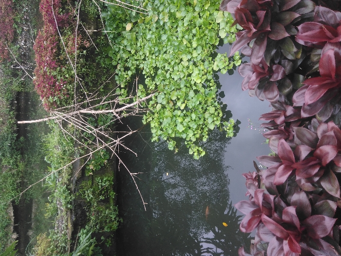 This image depicts a section of a water channel in Kladné, Czechia. The foreground features dense clusters of broad-leafed plants with a deep maroon-red coloration. Immediately behind these plants, a dark body of water occupies the mid-ground. On the right side of the water, a large mass of bright green, round-leafed aquatic plants floats on the surface. A bare, multi-branched tree limb extends from the upper right, diagonally into the water, resting partially submerged. The water's surface reflects overhead foliage, and a small, bright orange object, possibly a fish or fallen leaf, is visible beneath the surface on the left. The banks of the channel are overgrown with various green vegetation; the left bank appears to have a moss-covered, structured edge, while the right bank is densely vegetated with a mix of green and some reddish-purple foliage. No people or active interactions between subjects are visible. The environment is characterized by natural vegetation surrounding a contained water body.