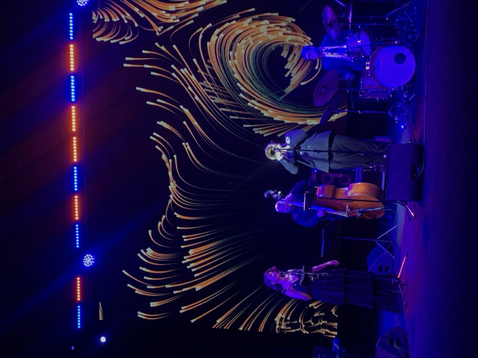 A live musical performance is depicted on a stage, likely at the International Center of Culture and Arts (Zhovtnevyi Palace) in Kyiv, Ukraine. A four-member jazz ensemble is performing under theatrical lighting. From left to right: 1. A female vocalist, dressed in a dark, tiered long dress, stands centered at a microphone, singing with her head tilted upwards. 2. A male bassist, wearing a dark long-sleeved shirt, stands playing an upright acoustic bass. 3. A male trumpeter, dressed in a dark suit jacket with a visible light-colored emblem on the left lapel, dark trousers, and glasses, stands playing a brass trumpet. 4. A male drummer, wearing a dark suit jacket, tie, and a dark beanie or cap, is seated behind a multi-piece drum kit, actively playing. The bass drum features the "Pearl" brand logo. The stage is illuminated predominantly with blue and purple light, casting shadows. Overhead, a row of red and blue LED stage lights is visible. Several black stage monitors are positioned on the floor at the front of the stage. The background consists of a large LED screen displaying a dynamic, abstract pattern of swirling, golden-orange lines against a black field.
