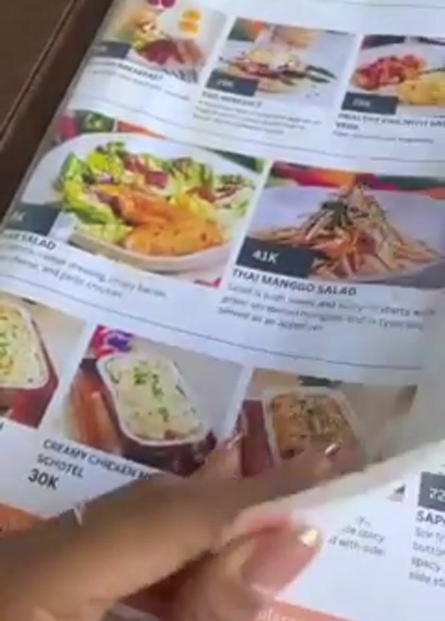 person looking at a menu at a restaurant. The menu is in English and contains pictures of various dishes, including salads, soups, and stir-fries. The prices are listed in Indonesian Rupiah. The person's hand is visible in the video, and they are wearing a ring. The background of the video is a patterned table.