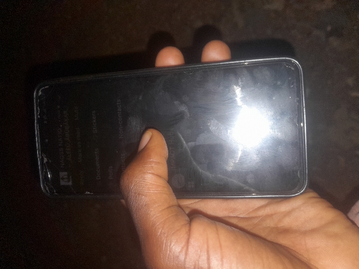 A dark-skinned left hand, likely an adult's, holds a black or dark gray smartphone vertically in Kaninkon, Nigeria. The phone's screen is extensively cracked, with notable damage along the top edge and visible lines radiating across the display. Numerous smudges and fingerprints are present on the screen surface. A prominent, bright light reflection obscures details in the lower-middle section of the display. Faintly visible elements on the screen include text such as "NAGSS NATIO...", "ALEFD. ABUBAKAR", "Reply", "Mark as read", "Mute", "Documents", "Stickers", "Polls", "Contacts", "Non-contacts", and "IMPACT HUB", indicative of a messaging or application interface. The thumb of the holding hand is positioned on the screen, suggesting active interaction. The background is dark and out of focus, providing no discernible environmental details other than a low-light setting.