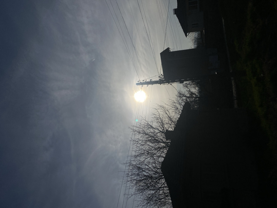 The scene, located in Dobri dial, Bulgaria, depicts an outdoor environment under a bright, partially cloudy sky, backlighting the foreground and midground elements. The sun, visible as a bright disc, is positioned centrally in the upper mid-frame, causing a prominent lens flare. Multiple horizontal utility lines traverse the sky. In the midground, a dark utility pole with attached equipment stands vertically. To its left, the dark silhouette of a residential building's gabled roof and chimney is visible, flanked by numerous bare, leafless deciduous trees. To the right of the utility pole, a tall, dark, rectangular building, possibly a utility station, is silhouetted, partially obscuring a lighter-colored residential building with a tiled roof and visible windows. The foreground consists of dark, undifferentiated ground cover. A faint airplane contrail is observable in the upper sky. No individuals are present.