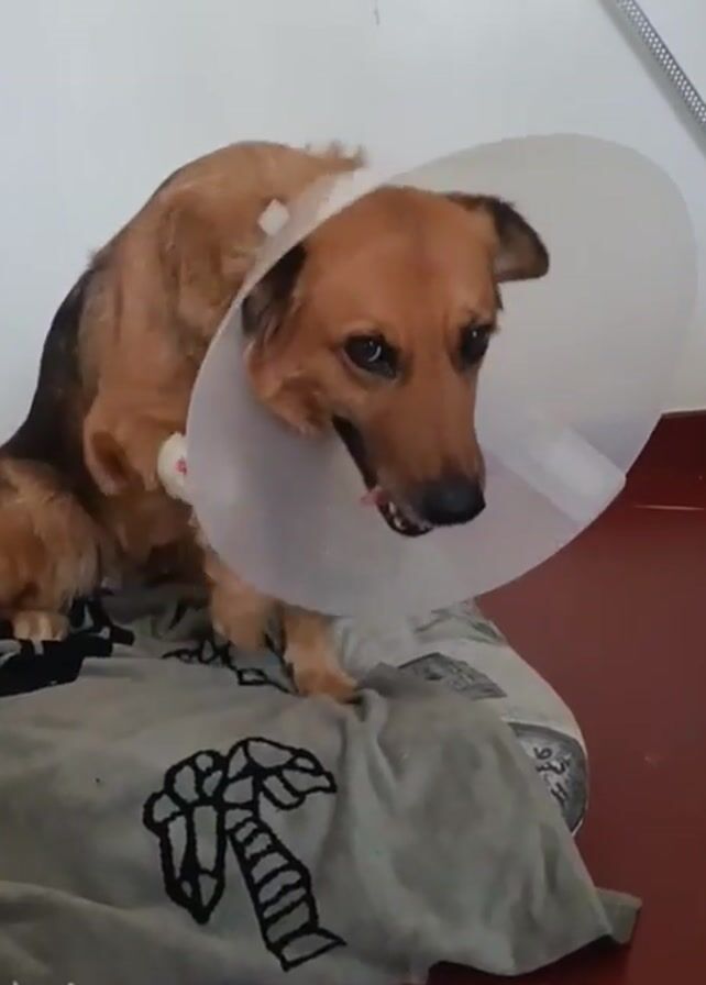 - "brown and black dog wearing a clear plastic cone around its neck, resting on a gray patterned blanket" by FM-E8rQG2, licensed under CC BY 4.0