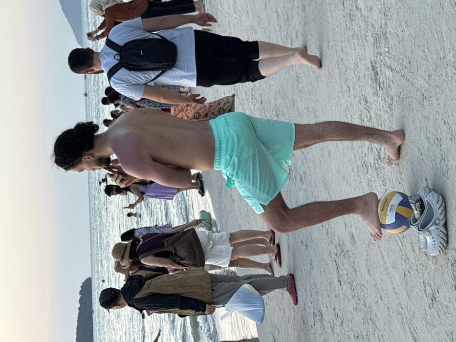 The image depicts a beach scene at Cenang Beach, Malaysia, at what appears to be dusk or early evening. The foreground is dominated by a sandy beach, traversed by numerous individuals. A shirtless man, with dark curly hair tied back in a bun, is positioned in the lower-left to central frame, facing slightly right, with his back partially visible. He wears mint green swimming shorts. His left foot rests barefoot on top of a yellow, blue, and white volleyball, which in turn rests on a pair of light grey Crocs clogs. A metal beverage can is visible inside one of the clogs. The man's skin on his back shows signs of sunburn. He appears to be holding a dark, elongated object, possibly an electronic cigarette or vape device, to his mouth. To the left of the central man, a person in a brown jacket and light trousers holds a white plastic bag. Further left, a person in a straw hat and white shorts carries light green flip-flops. Multiple other individuals are scattered along the shoreline and in the shallow water, many appearing to observe the surroundings or take photographs with smartphones. One person, partially obscured, wears a purple dress and holds a phone up. Another person walks away from the viewer in the mid-right, wearing a light blue t-shirt and dark shorts, with a small black backpack. A person in a brown top and head covering is visible in the far right background, also appearing to take a photo. The background features the calm ocean with gentle waves lapping the shore. A distant island or landmass is visible on the horizon under a pale, overcast or sunset sky. Several small boats are faintly discernible on the water.