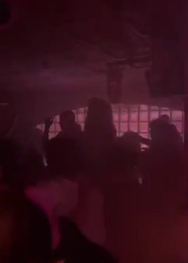 nightclub with people dancing. The club is lit with purple and red lighting, with fog machines creating a hazy atmosphere. The crowd is silhouetted and appear to be enjoying the music. A person wearing a baseball cap is visible in the second frame.