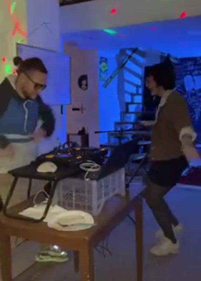 two people dancing indoors, with one operating a DJ setup. The DJ, a man with glasses and a hoodie, stands behind a table on which the DJ equipment is set up. A woman in a dark dress and light-colored jacket dances in front of the table. The lighting in the room is blue, with multicolored lights flashing. In the background, there's a staircase and a wall with artwork or graffiti. Another person briefly appears in the background near the stairs. The DJ appears to be enjoying himself, moving and grooving along with the music. The atmosphere seems relaxed and fun.