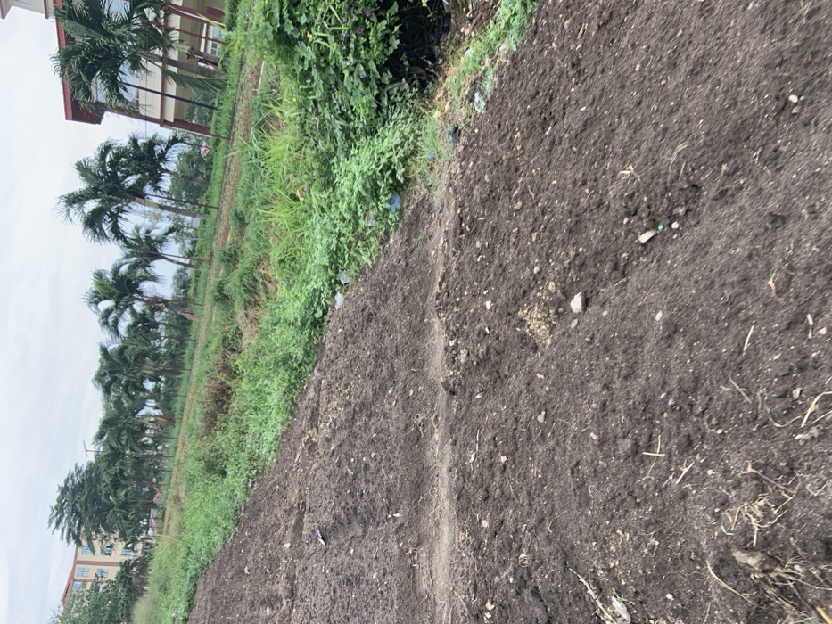 A field of dark soil dominates the right side of the image, showing loose dirt and small rocks. A strip of green vegetation separates the soil from a line of palm trees in the background. Beyond the palm trees, buildings are visible. The sky is overcast, casting a dull light over the scene. The landscape suggests a rural or developing area near a town.