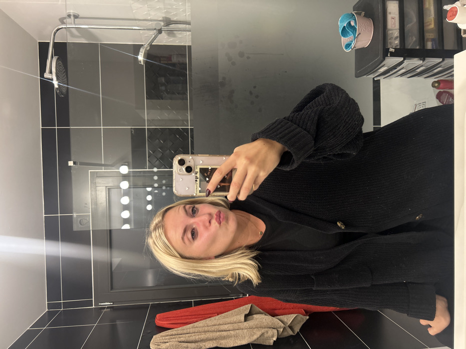 A woman with blonde hair takes a selfie in a bathroom mirror. She wears a black cardigan and a black shirt. Behind her is a shower with black and grey tiles, and a clear glass screen. A red and beige garment lies on the black tiled floor. A shelf above the toilet holds bathroom accessories. The phone case she's holding is clear with decorations. Her expression is playful, with her lips pursed.