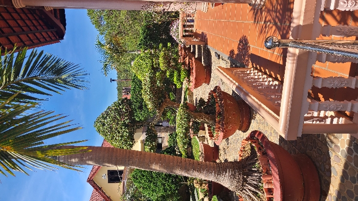 A vibrant outdoor scene features a lush garden with potted plants and manicured trees. A tall palm tree stands to the side. A building with a red-tiled roof is visible in the background. The foreground reveals a tiled porch area with a decorative railing. The image captures the beauty of a well-maintained garden and its architectural surroundings.