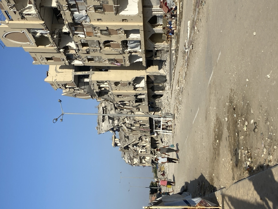 The image depicts a street scene in Khan Yunis, Palestinian Territory, dominated by extensively damaged multi-story residential or commercial buildings under a clear blue sky