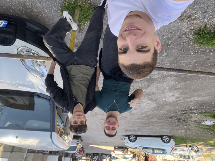 An image taken in Pazardzhik, Bulgaria, depicts three Caucasian males, estimated to be in their late teens to early twenties, posing for a photograph in an unpaved outdoor area