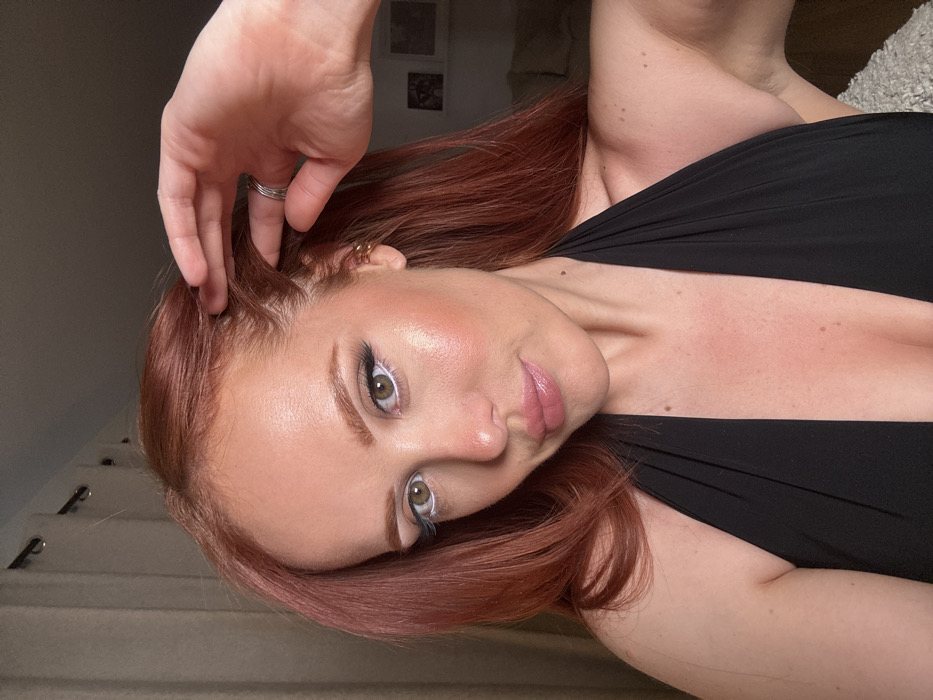 A red-haired woman poses from a slightly angled perspective. She wears a black dress and has her hand near her hair. Her makeup is visible, including white eyeliner and blushed cheeks. A wall is visible in the background. The image is well-lit.