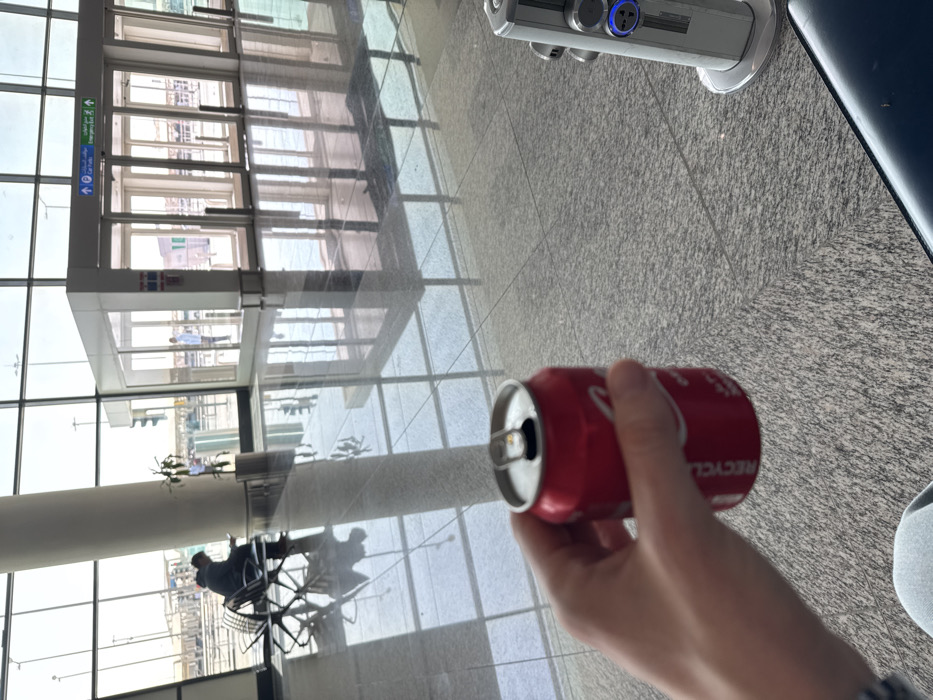 An indoor scene within a modern airport terminal in Dubai, United Arab Emirates, is depicted. The primary subject in the foreground is a left hand holding an open, red Coca-Cola can, with "RECYCLE" visible on its side. The hand is positioned over a light gray, speckled granite tile floor. To the immediate right, a gray power outlet tower with blue illuminated buttons is partially visible. A dark blue seat edge is present in the lower right corner. In the midground, a person is seated on a gray metal bench, partially obscured by a large, white cylindrical pillar. This individual is engaged with a small electronic device. A potted plant stands near the pillar. The background features expansive floor-to-ceiling glass windows framed in dark gray, offering a view of an outdoor area with distant buildings and a clear sky. Centrally positioned is a structure with automatic glass doors, above which a sign reads "Car Gates" and "Emergency Exit" in both English and Arabic. A person in a light-colored shirt is visible standing near these doors. The highly polished floor throughout the terminal reflects the overhead structures, windows, and distant figures. Bright daylight illuminates the scene from the exterior.