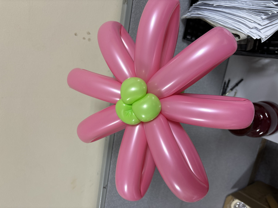 An indoor scene displays a balloon art creation resembling a flower, centrally positioned in the foreground