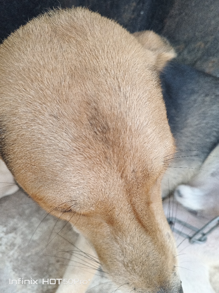 A close-up, overhead shot features the head and snout of a brown dog. Its fur is short, smooth, and tan, reflecting light. The dog's head is slightly tilted, displaying a small ear on the right. Whiskers are visible near the snout. In the background, another dog with gray fur is partially visible. The foreground includes elements of a gray surface, possibly concrete. A thin metal chain is also discernible in the lower right corner.