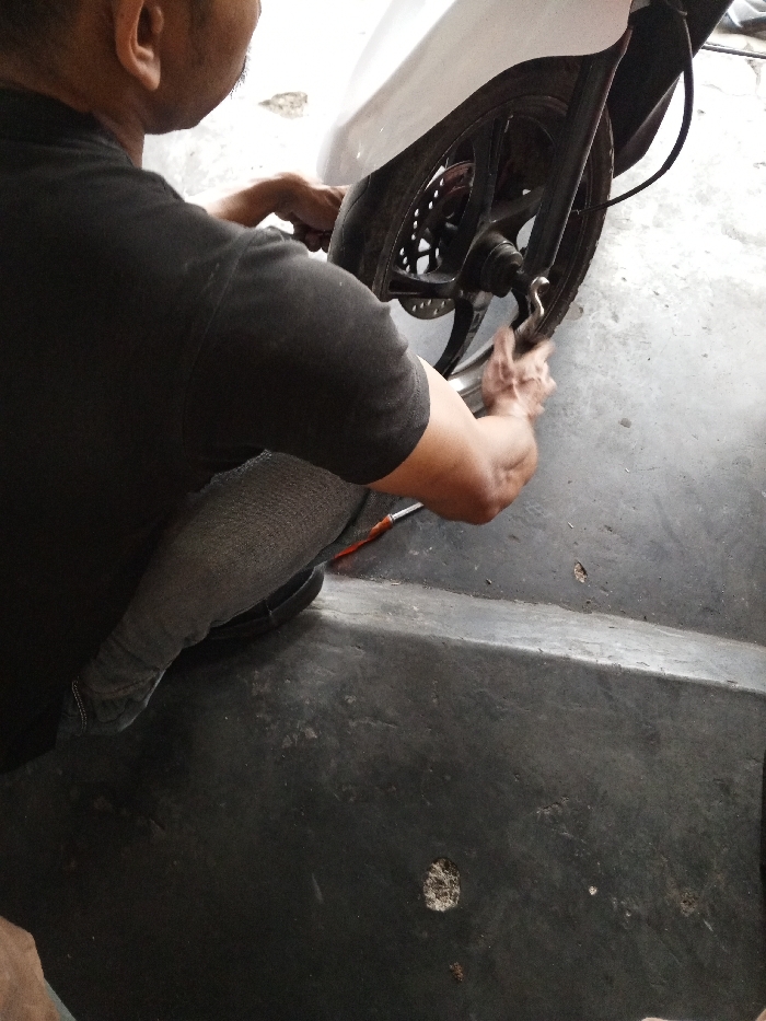 - "The image captures a male individual from an elevated rear perspective, crouching over the front wheel of a white motor scooter" by FM-Id8Q12, licensed under CC BY 4.0