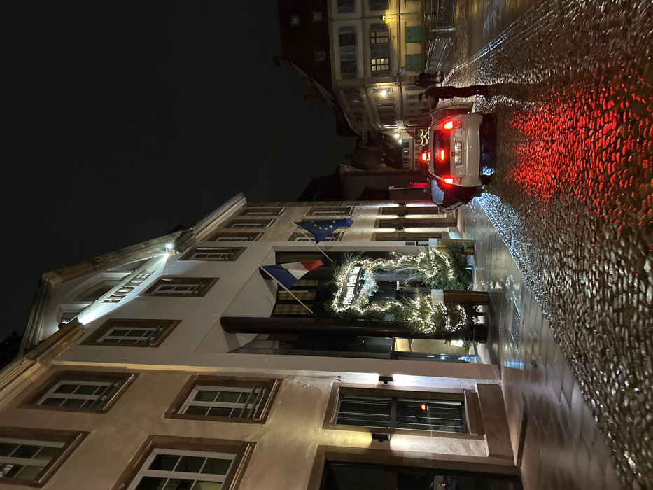 A three-story hotel stands under a dark sky, illuminated by warm lights. Flags of the EU and France are visible, along with festive lights. A white car with illuminated tail lights and a person beside it are visible, and the street is paved with cobblestones that are reflecting the light. Other buildings line the street in the distance.