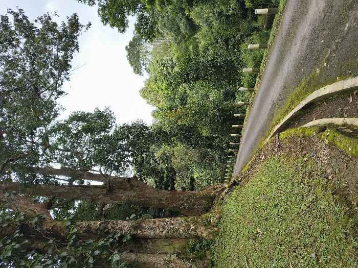 A road curves through a lush green landscape. A line of evenly spaced posts borders one side of the road, protecting a steep drop-off covered in vegetation. On the opposite side, a large tree with thick branches extends towards the sky, showcasing its gnarled bark. The sky is visible through gaps in the dense tree canopy, suggesting a vibrant and overgrown environment.