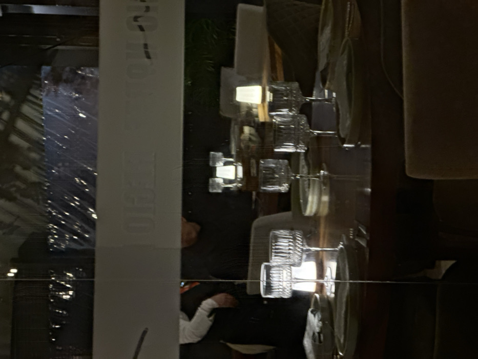 long table set with wine glasses, plates, and flatware. People are seated at the table, and one person is holding a phone. A white sign with the word "TECHNO" in capital letters is prominently displayed on the left. The setting appears to be a restaurant or bar at night.