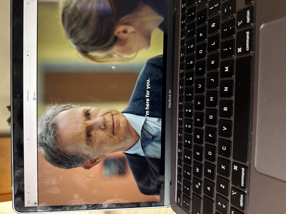 The image displays a MacBook Air laptop from a slightly elevated, angled perspective. The laptop screen is actively playing a video from Netflix, as indicated by "netflix.com" in the browser tab and the Netflix logo. The screen itself shows multiple visible smudges and fingerprints. The video depicts two individuals indoors. In the foreground, a middle-aged Caucasian male with grey hair, wearing a dark suit jacket and a blue patterned tie over a light blue shirt, looks slightly to his right. Text overlayed on the video, positioned over his chest, reads "I'm here for you." Partially visible behind and to the right of the male is a Caucasian female with light brown hair, seen from behind her left shoulder, facing the male. The background of the video consists of blurred interior walls in shades of orange and yellow. The laptop's dark-colored keyboard is visible in the lower portion of the image, featuring a Spanish layout with an 'Ñ' key. The immediate environment surrounding the laptop is out of focus, revealing no discernible details about its location within Mexico City.