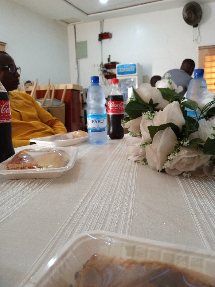 The scene is set in a private residence in Yola, Nigeria, at the coordinates 9.198 latitude and 12.491 longitude. There are four people present: one seated on a chair wearing a yellow shirt, one partially visible standing in the background wearing a white shirt, and two others standing in the background who are not visible. The scene is set on a white table covered with a white tablecloth. The table is set with two plates of food and four beverages: a glass bottle of Faro mineral water, a bottle of Coca-Cola, a glass bottle of water, and a bottle of coca-cola. A bouquet of white roses is located in the foreground of the image. The room is sparsely furnished and the walls are painted white. The room appears to be an interior dining room or living room. There is a blue refrigerator in the background. The overall mood of the scene is casual and relaxed.