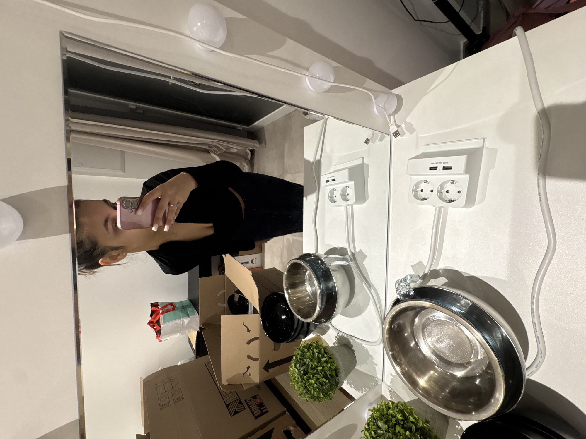 A medium indoor shot shows a vanity mirror with a woman holding up a pink cell phone, presumably taking the picture in the mirror. A strand of lightbulbs is along the top of the mirror. The wall behind the mirror features power outlets with USB ports and attached lighting fixtures. Below the mirror is a surface with small plants and boxes. The boxes have the name "CITCO" printed on them, which could potentially indicate a connection to the city of Mönchengladbach, Germany, where CITCO has offices. The woman is wearing black clothing. Her fingernails are painted white.