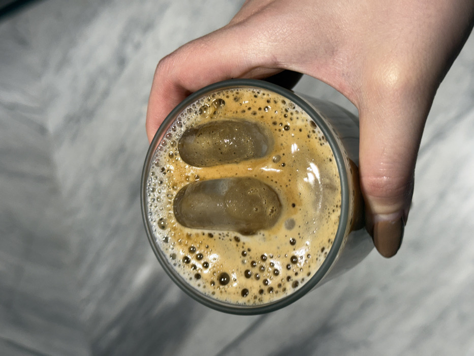 A close-up, overhead perspective image depicts a clear glass held by a human hand. The glass contains a dark brown iced coffee beverage topped with a significant layer of light brown crema, exhibiting numerous small bubbles. Two elongated, irregular cylindrical ice cubes are submerged within the coffee. The hand, visible gripping the glass, appears to be a fair-skinned right hand with the thumb and index finger prominent. The fingernails are painted with a light brown or nude-colored polish. The background consists of a light gray surface with subtle darker gray veining, suggestive of a polished marble or stone countertop. No specific location within Zapopan, Mexico, is identifiable from the visual content of the image.