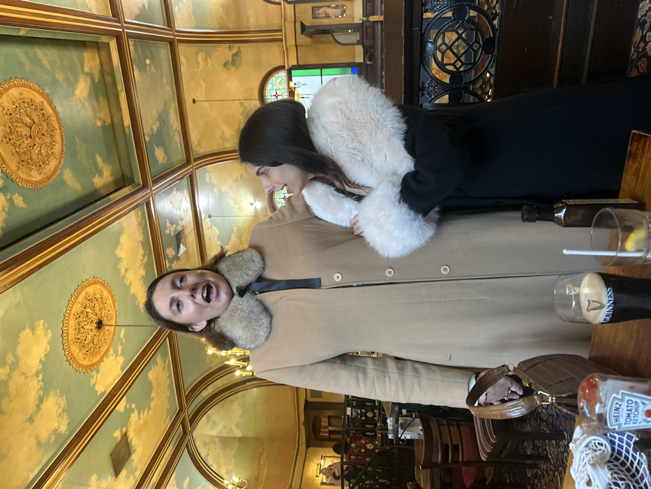 Two women pose indoors. One wears a tan coat with a furry collar and a black ribbon, while the other wears a black coat trimmed with white fur. A pint of Guinness, a clear glass with a straw, and a bottle of Heinz ketchup sit on the table. The ornate ceiling is painted light blue with white clouds and decorative golden medallions. The background includes wooden chairs and other patrons in the establishment.