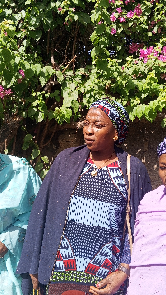 The scene depicts three individuals outdoors in Unknown, Unknown, against a backdrop of dense green foliage interspersed with pink-purple bougainvillea flowers, partially obscuring a dark, textured wall. The central figure is an adult female with dark skin, wearing a multi-patterned headwrap in blue, black, white, red, and green. Her attire includes a long garment with light blue, dark blue, white, red, and green patterns, covered by a dark blue shawl with small, metallic dots. She wears gold-colored circular earrings, a gold-colored necklace with a circular medallion pendant, a dark-strapped watch, and a beaded bracelet. A brown leather shoulder bag strap is visible over her right shoulder. She is standing, looking towards the viewer's right, with her hands clasped in front. To her left, a portion of another individual wearing a light blue embroidered garment is visible. To her right, a portion of a third individual wearing a light purple perforated garment and a dark patterned headwrap is visible. All subjects are standing under bright, natural light.