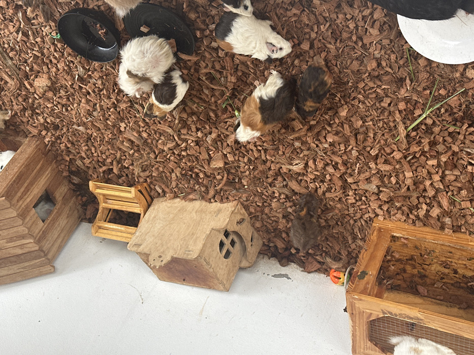 Several guinea pigs are scattered on wood chip bedding. Some are near black feeding dishes. Wooden houses and structures are positioned around the bottom left. One guinea pig is positioned near a house made of wood.