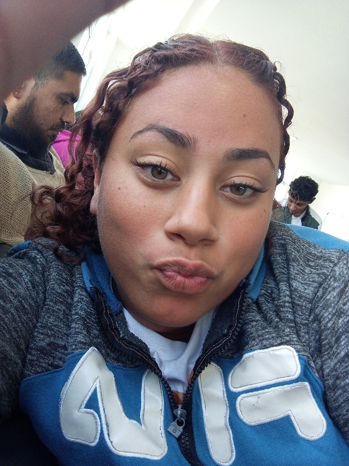 A selfie features a woman with hazel eyes, brown curly hair styled in small braids, and pursed lips. She wears a gray and blue Fila zip-up hoodie over a white shirt. In the background, two men are visible, one partially obscured on the left, and another seated further away on the right. The picture appears to have been taken indoors in an area with fluorescent lighting.