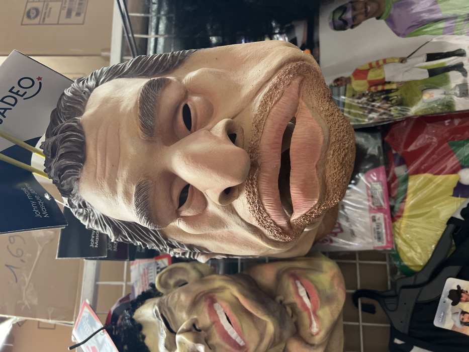 This image depicts a retail display in Aubervilliers, France, showcasing various masks and costumes