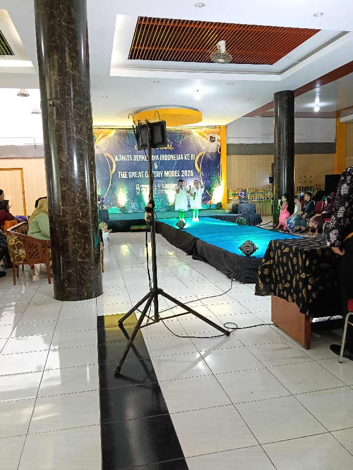 A bright room is set up for a fashion show, with a blue runway stage centered. Two young girls stand on stage wearing white dresses and green tights. A large black light stand is positioned prominently in front. A backdrop with "WANITA BERKEJAYA INDONESIA KE III & THE GREAT GATSBY MODEL 2026" is displayed. Rows of chairs with attendees line the sides of the stage. Decorative pillars flank the performance area. The floor is tiled in white and black.