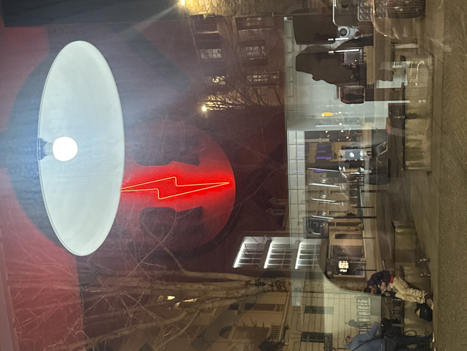 A white lamp with a lightbulb shines in front of a red circle containing a red lightning bolt. Behind this is a reflection in a window. Buildings, bare tree branches, a street, and people are reflected. The reflection shows a store interior with tables and chairs. People are on the sidewalk outside the store.