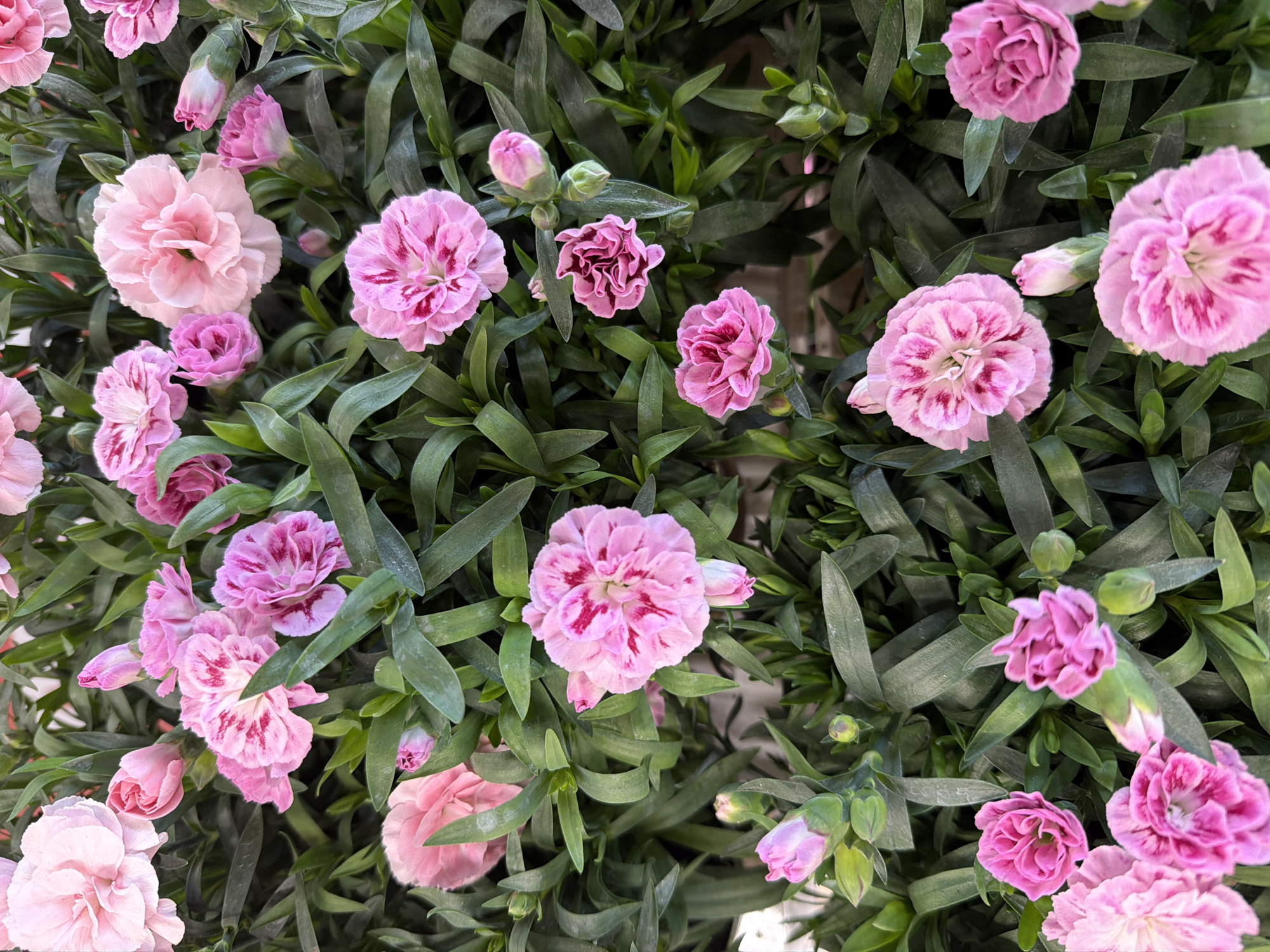 The image displays a dense arrangement of flowering plants, identified as Dianthus, or Pinks/Carnations, observed from an overhead perspective