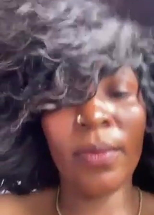 A close up shot features a Black woman wearing a gold nose ring and a gold necklace. She has dark, curly hair that is blown around her face by wind. The background is indistinct but appears to be the interior of a moving vehicle. The woman's expression is neutral. The video appears to be handheld.