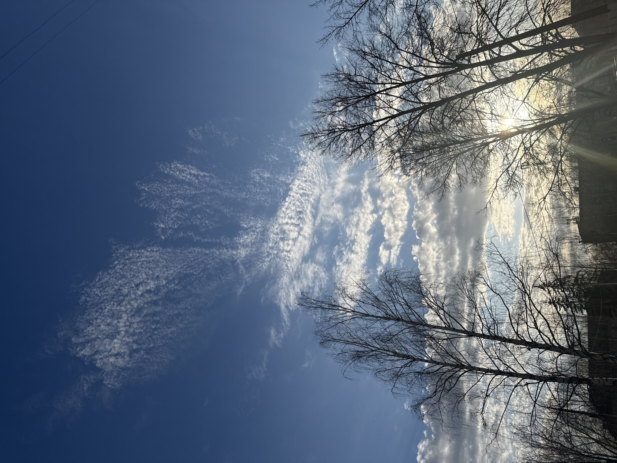 view of the sky with bare trees. The sky is a gradient of blue, with a patch of cirrocumulus clouds in the upper left. There are also cumulus clouds and some contrails in the lower right. The bare trees are silhouetted against the bright sky, with some sun rays peaking through the branches. A building is visible in the upper right corner. Thin electrical cables stretch diagonally across the upper left corner. There are no people visible in the image. The location appears to be Chaikovsky, Russia based on similar outdoor scenes, especially the building architecture, cloud formations and bare trees at this time of year.