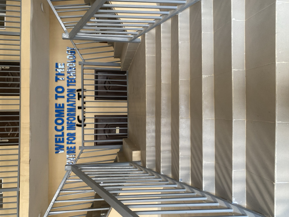 The image displays the exterior entrance to a building identified as the Centre for Information Technology (C.I.T.) in Rijiyar Zaki, Nigeria. A broad flight of light-colored, tiled stairs, bordered by grey metal railings, ascends to a tiled landing. Positioned directly above the landing on a light yellow building facade, prominent blue raised lettering reads "WELCOME TO THE CENTRE FOR INFORMATION TECHNOLOGY (C.I.T.)". Centered beneath this signage are two closed, dark brown wooden doors featuring vertical paneling. Above the main entrance and signage, a second story or balcony section is visible, equipped with a similar grey metal railing. The scene is illuminated by natural light, casting distinct diagonal shadows from the railings across the stair treads. No individuals are present in the depicted environment.
