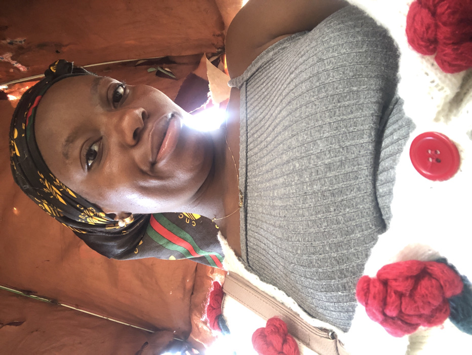 An adult female with dark skin is depicted from a low-angle perspective, looking directly at the camera with a slight smile. She wears a black headscarf patterned with yellow motifs and green and red stripes, revealing small golden hoop earrings. A thin golden necklace with a small pendant is visible. Her clothing consists of a grey ribbed spaghetti-strap tank top, overlaid with a white knitted cardigan featuring several large red yarn flowers/roses and a single prominent red button on the lower right. A light brown bag strap is visible over her left shoulder. The background is an enclosed space characterized by reddish-brown, textured surfaces, possibly fabric or unpainted walls, with structural elements visible on the left. A strong light source from the upper left creates a glare across the subject's face and chest. The exact location within Bukuru, Nigeria, cannot be determined from the visual information provided.